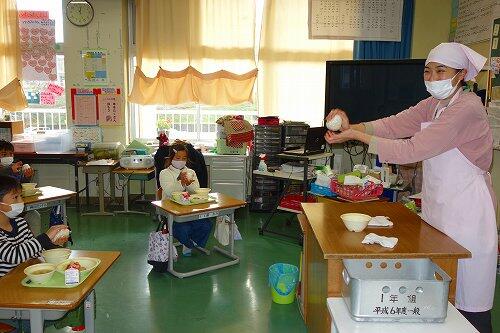 1年生が給食の時間におにぎり作りに挑戦していました。ラップにご飯をのせて、ギュッとむすんでいくと、おいしそうなおにぎりができました。