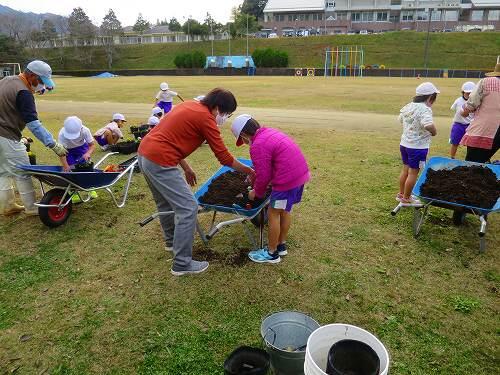 1・2年生が、花の植え替えをしていました。一人で3つの鉢をお世話していきます。花はパンジーとビオラです。これから大きく育てて、きれいな花が咲くといいですね。