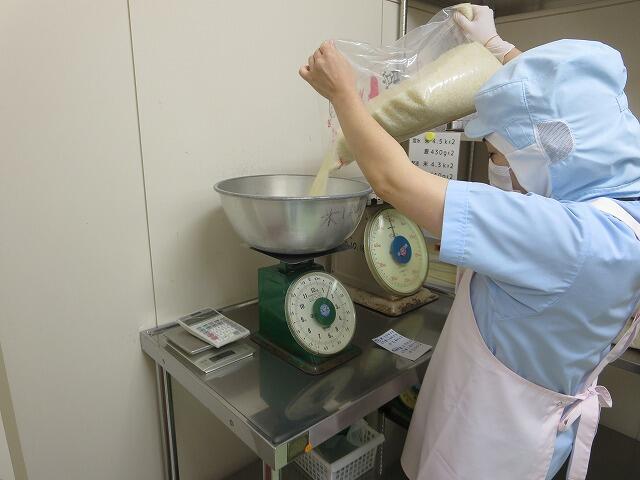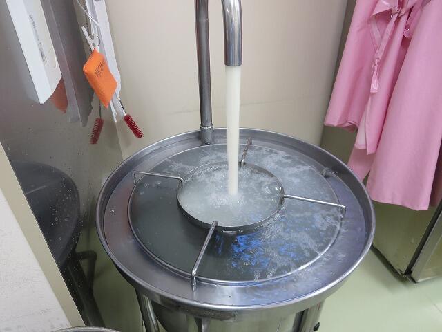 お米ともち米をそれぞれ量って洗米機にかけます。↑2枚目がお米を洗っているところです。(水とお米が一緒に循環することで洗米できるしくみになっています。)