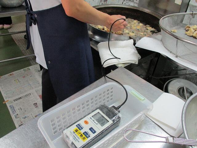 食中毒予防のため、85℃以上に温度が上がっているか確認し、ザルにあげます。