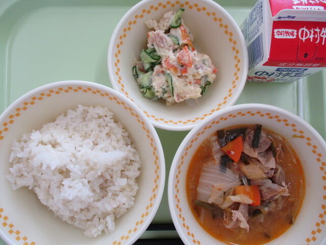 【麦ご飯 キムチ鍋 ポテトサラダ 牛乳】
