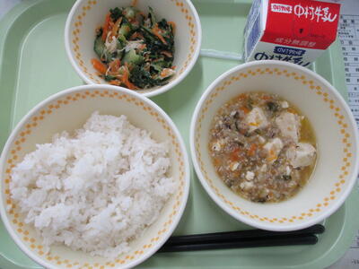 豆腐は、消化がよく、栄養価も高い食べものです。2000年以上も前に、中国で作られました。奈良時代に、日本に伝わり、主に、お寺などで食べられ、江戸時代になって日本中の人が食べられるようになったそうです。今日の給食では、とうふを干ししいたけやにんじん、たけのこ、にら、たまねぎと一緒に五目煮にしました。