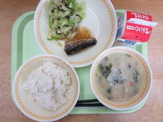 【麦ごはん 魚と大豆の揚げ煮 けんちん汁 牛乳】