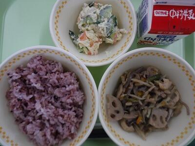 【十二穀米 根菜のきんぴら ポテトサラダ 牛乳】