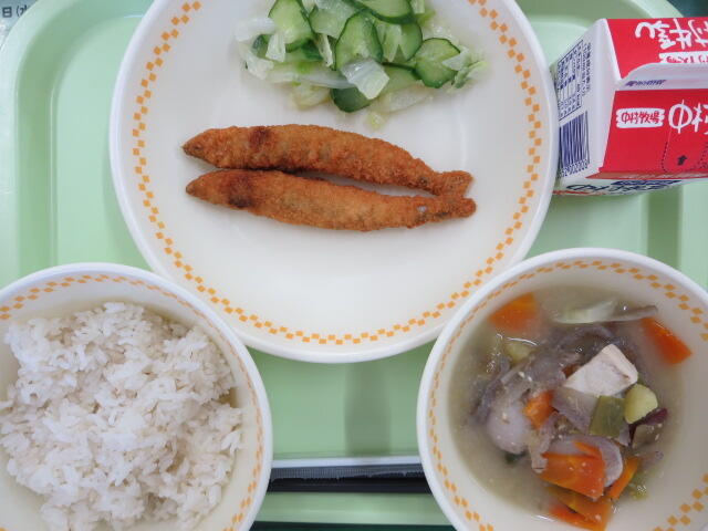 【麦ご飯 ししゃもフライ 中華きゅうり さつま汁 牛乳】