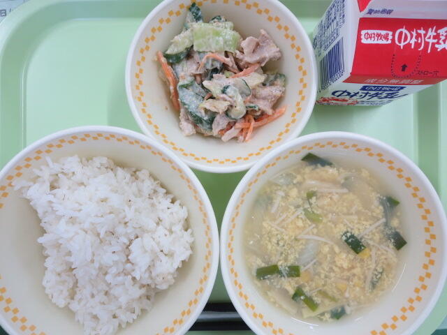 【麦ご飯 ボイルドポークのごまソース たまごスープ 牛乳】