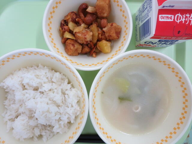 トックとは、主にうるち米で作る韓国伝統の「もち」のことです。日本のもちは、もち米で作りますが、トックはうるち米で作っているので、加熱しても伸びたりすることがいので、炒めものなどにも使われています。今日は、スープに入っています。日本のもちとの違いを味わってください。 もう一つは、小さいおかずに入っているカシューナッツについてお話しします。カシューナッツには、カルシウムの吸収を高める「亜鉛」や、血液に含まれる「鉄」がたくさん入っています。食べすぎはよくありませんが、骨折や貧血を予防することができるので、みなさんにおすすめの食べ物です。今日は油で揚げた高野どうふやさつまいもと一緒に砂糖じょうゆをからめて味付けしています。よく噛んで食べてくださいね。
