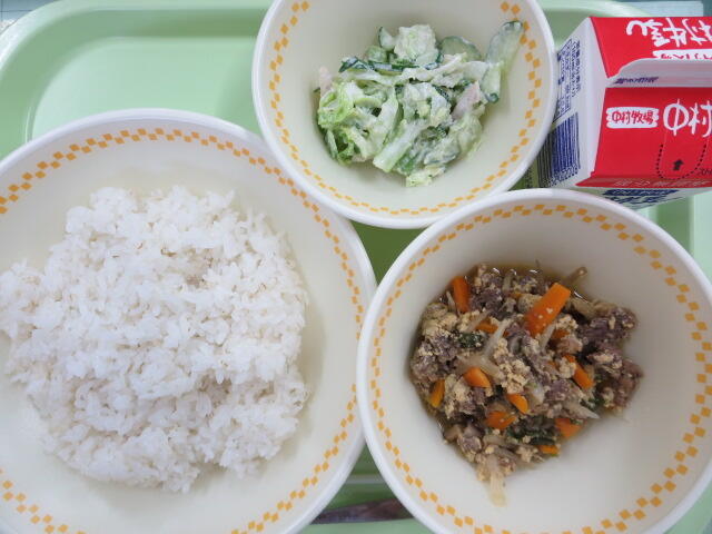 今日は小さいおかずのサラダにゆでた豚肉が入っていました。お肉が入っていると食べやすいようで、きゅうりが嫌いな子も「意外とおいしい」とパクパク食べていたそうです