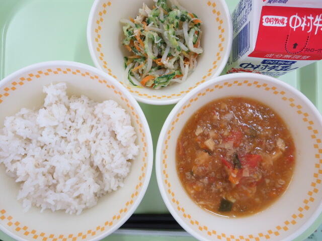 【麦ご飯 トマトのマーボー厚あげ バンバンジー 牛乳】