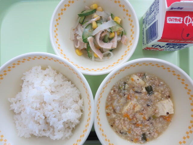 【麦ご飯 塩マーボー豆腐 大根サラダ 牛乳】