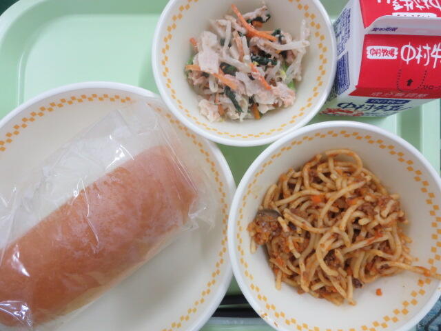 【米粉パン なすのミートソーススパゲッティ シャキシャキごまサラダ 牛乳】