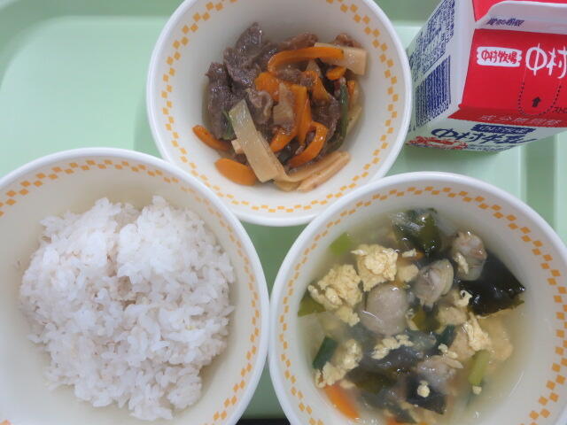 【麦ご飯 チンジャオロース 海の幸のたまごスープ 牛乳】