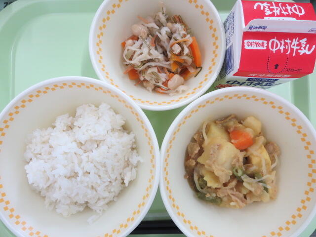 【麦ご飯 カレー肉じゃが まだかづけ 牛乳】