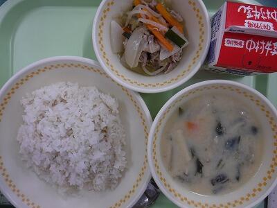 【麦ご飯 五目豆 ごまあえ 牛乳】