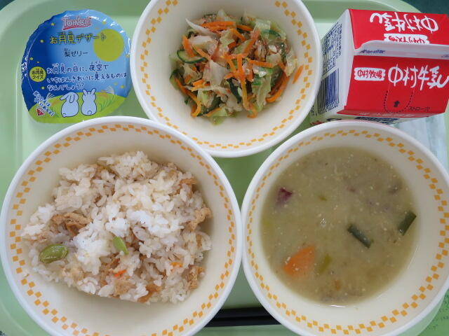 【こぎつねごはん うめおかかあえ さつま汁 お月見デザート 牛乳】