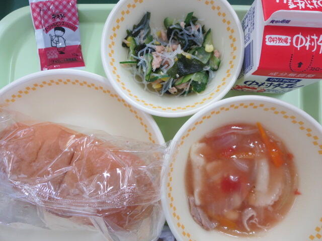 今日のパンは、各学校に備蓄していた非常食です。地震や大雨などの災害時には、電気やガスが使えなくなったり、道路が寸断され、食べ物が手に入らなくなったりすることもあります。そんなときは、お家にあるものや非常食を食べることになります。最近では非常食も進化していて、なんと、25年保存できる雑炊や、冷蔵庫に入れずに90日ももつ牛乳などがあるそうです。今日のパンは5年前に買っていただいたものです。非常時はごはんやパンなど、炭水化物に偏り、野菜や果物などのビタミン類が不足しやすいので、栄養バランスを考えたものを備蓄するといいですね。今日も食べ物に感謝する気持ちを忘れずにいただきましょう。