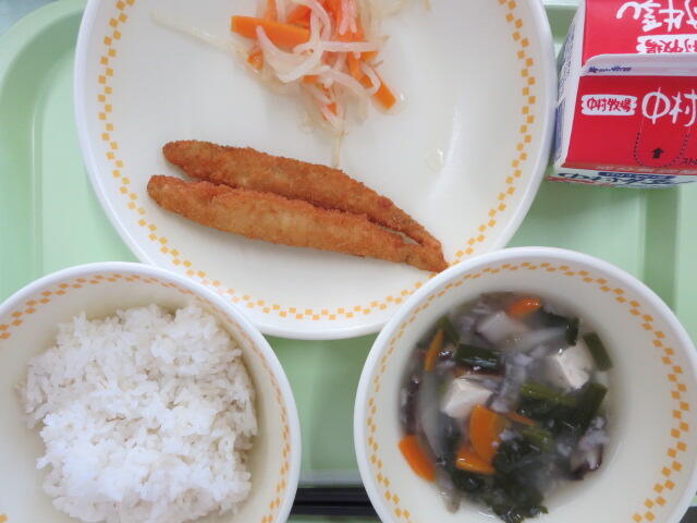 ししゃもは、漢字で「柳の葉の魚」と書くように、15cm位の細長い魚で、日本では北海道でとれます。しかし、あまりたくさんはとれないので、私たちがよく見るのはほとんどがロシア・カナダ・アメリカなどでとれた「カラフトししゃも」です。今日の給食のししゃもは「子持ちししゃも」と呼ばれるメスのししゃもで、脂が多く、味もおいしいのが特長です。頭から全部骨ごと食べられるので、たんぱく質、カルシウム、脂が多く、味もおいしいのが特長です。頭から全部骨ごと食べられるので、ビタミンB2がたくさんとれます。しっかりよくかんで食べましょう。