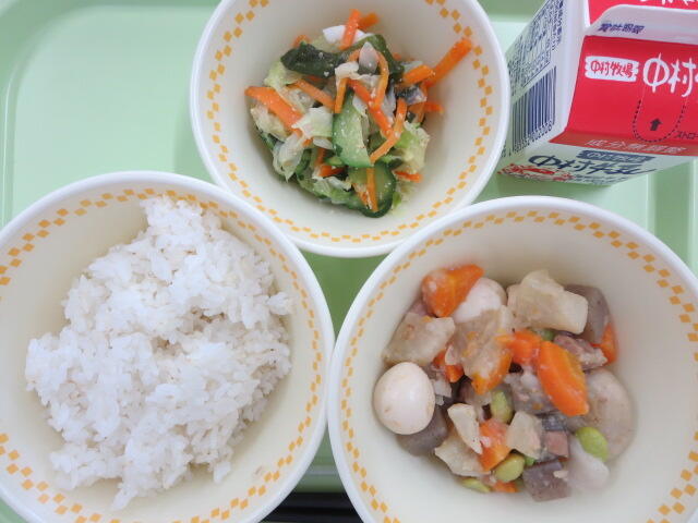 今日の大きいおかずは、漢字で「関東煮」と書いて、かんとだきといいます。みなさんがよく知っているおでんのような料理ですね。白いボールのようなものは「はんぺん」です。普通お店で売っているものは四角い形をしていて、白身魚のすり身と山芋、調味料を合わせて練って作られます。はんぺんの他にも、今日は大根やこんにゃく、うずらの卵などを入れました。味わって食べてくださいね。