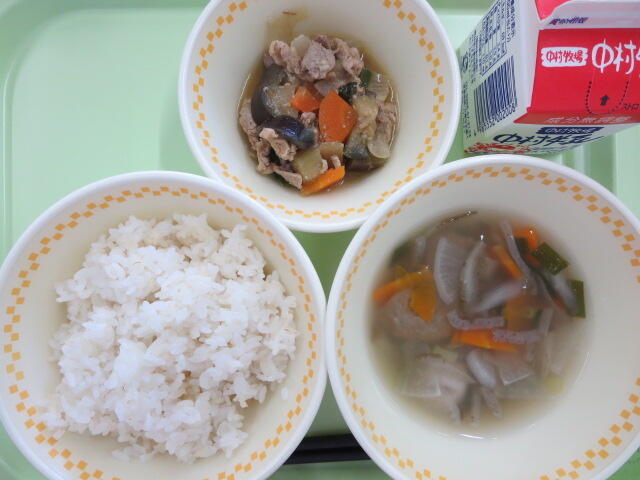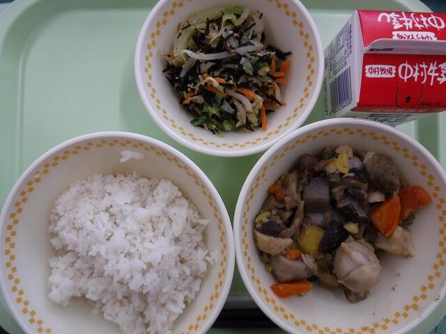 【麦ご飯 秋野菜の煮物 ひじきのサラダ 牛乳】