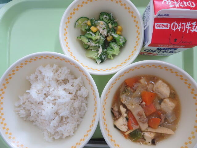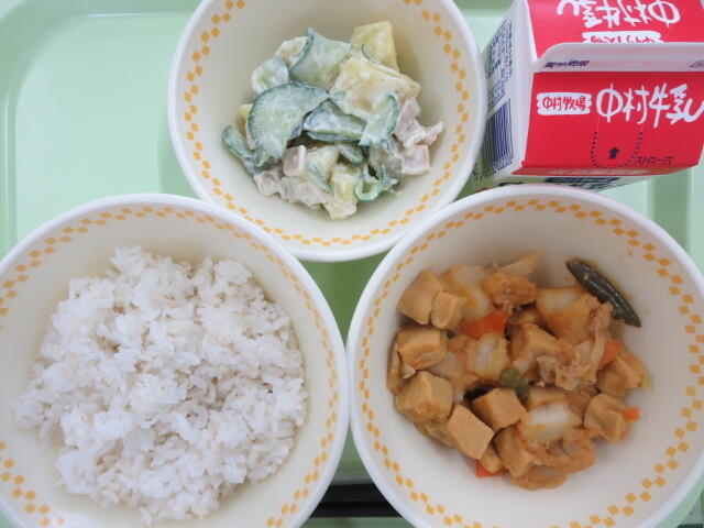 【麦ご飯 高野豆腐と鶏肉のカレーに スイートポテトサラダ 牛乳】