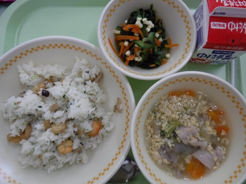 【海鮮ピラフ ふわふわスープ ほうれん草のチーズサラダ 牛乳】
