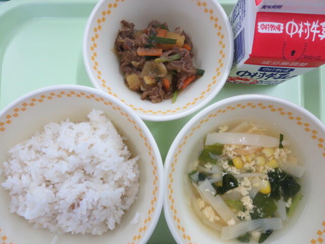【麦ご飯 さつまいもとなしのプルコギ かき玉スープ 牛乳】