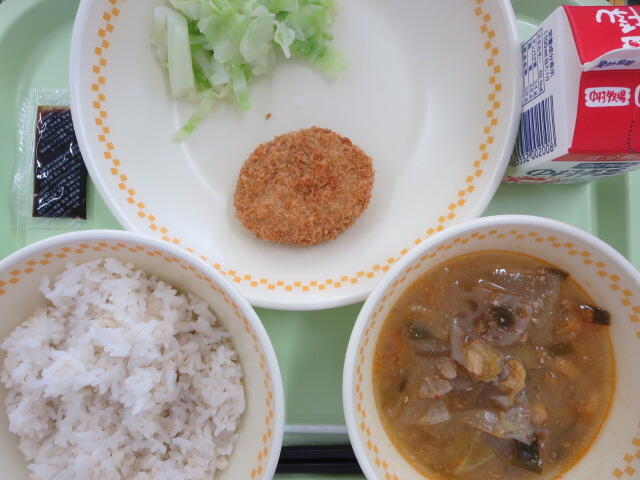 【麦ご飯 ミンチカツ ゆできゃべつ 根っこ野菜のごまキムチ汁 牛乳】