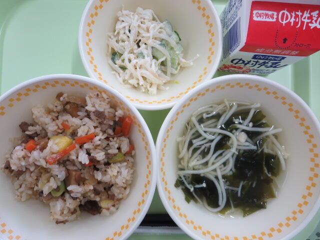 【ぎゅっとまぜ栗ごはん 魚そうめん汁 切り干し大根のサラダ 牛乳】
