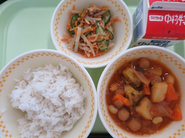 【麦ご飯 ウインナーのトマト煮 ごぼうサラダ 牛乳】
