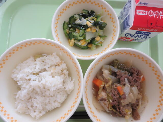 今日は地産地消の日です。今日の給食に使われている材料のうち、地元でとれた食品は、さつまいも、牛肉、ねぎです。「すき焼き」は、おすし、天ぷらとならんで、日本を代表する料理の一つです。江戸時代、「すき」という農具の上に、タレにつけこんだ「鴨」や「鷹」、「鹿」などの肉をのせて焼いたのがすき焼きのはじまりです。牛肉を使うようになったのは明治時代からで「牛鍋」と呼ばれていたそうです。いろいろな材料が一つの鍋に入ったすき焼きは栄養たっぷりです。食べ物に感謝して、味わって食べましょう。