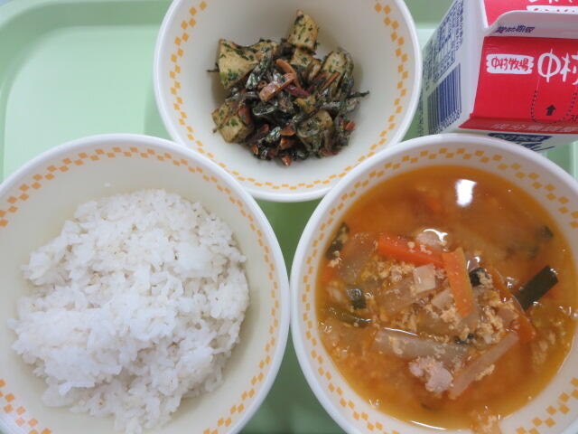 【麦ご飯 豆乳鍋 韓国風グリーンサラダ 牛乳】
