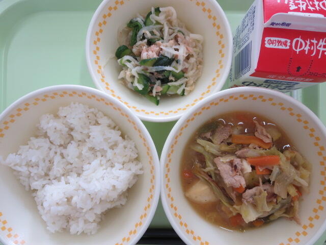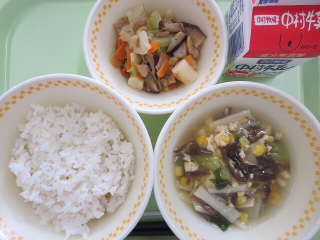 【麦ご飯 トッポギの野菜炒め 中華風卵スープ 牛乳】