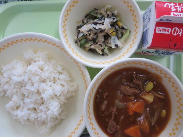 今日は、カミカミデーです。一口20回、できる人は30回噛んで食べましょう。みなさんは「貧血」という言葉を知っていますか?貧血とは、血液の中の鉄という栄養素が少ないために起こる病気です。疲れやすくなったり、顔が白くなり、めまいや耳鳴りが起こったりします。貧血というと、女子に多いイメージがありますが、実はスポーツをする人も注意が必要です。たとえば、走ったり飛んだりすると、足の裏に衝撃が加わり、鉄を運んでいる赤血球という袋が壊れてしまうので、鉄不足になります。日々の生活や運動のパフォーマンスにも影響するので、鉄が不足しないように毎日3回の食事を欠かさず食べましょう。今日の給食では、いりこや豚肉に鉄がたくさん含まれています。残さずたべてくださいね。