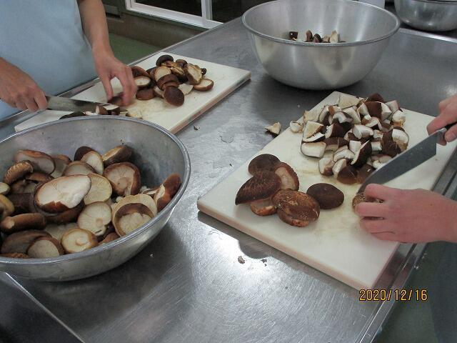 今日は地産地消給食の日です。今日だけでなく、給食には、西臼杵地区でとれたしいたけを使っています。いつも使うしいたけは乾燥させた干ししいたけですが、今回は生のしいたけを使いました。油で揚げたしいたけとさつまいもに、酢と砂糖、しょうゆなどを合わせた南蛮酢をかけて和えました。味わって食べてくださいね。
