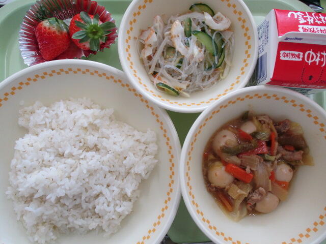 【ホイコーロー丼 春雨サラダ いちご 牛乳】