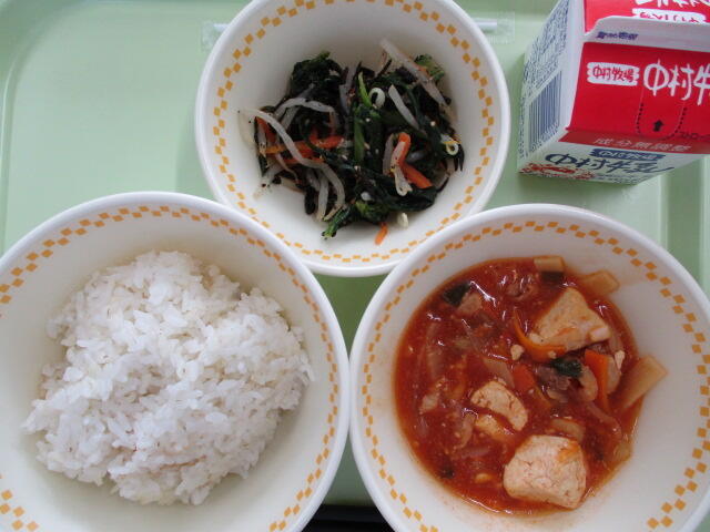 チリソースとは、トマトソースにとうがらし、塩、砂糖などを加えた辛みのあるソースです。えびチリなどが有名ですね。今日の給食では、えびや豆腐をチリソースで煮込みました。辛いという人は、ごはんと一緒に食べたり、牛乳を飲んだりしながら、少しずつ食べてみてください。さて、給食では毎日野菜を使いますが、1日にどのくらいの野菜を食べればいいか知っていますか。100gは色の濃い野菜、250gは色のうすい野菜でとらなければなりません。苦手な野菜がある人も少しずつでも食べていくと、だんだんその味に慣れて食べられるようになります。苦手な野菜も少しずつチャレンジしてみようという気もちが大切です。残さず食べてくださいね。