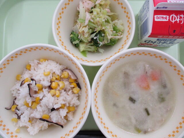 【きのコーンご飯 飛鳥汁 カリフラワーのあまずあえ 牛乳】