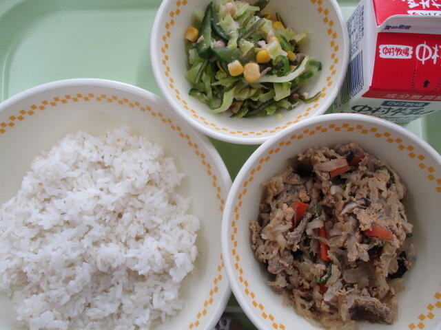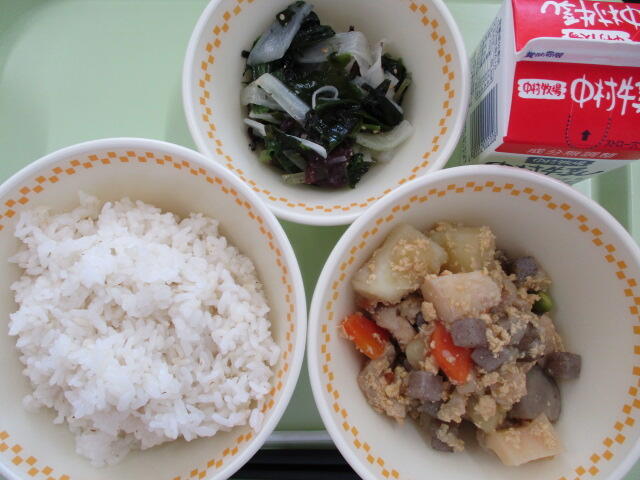 今日は、高千穂牛や千切り大根、ピーマンなど、宮崎県産の食材をたくさん使った「おいしさぎゅっと丼」でした。今日の牛肉は、新型コロナの影響で消費が落ち込んだ県産食材の消費拡大を図るため、学校給食に提供されているものです。(今年度はすでに、この予算で牛肉を2回、9月にうなぎ、1月にぶりを出しました。今後は、2月にまだいと地鶏、3月にマンゴーを出す予定です。おいしいものがたくさん食べられてありがたいですね。)