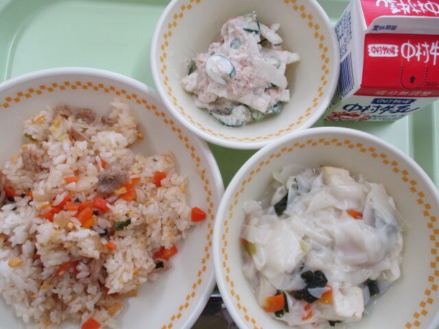 【キムチチャーハン ワンタンスープ 大根のマヨぽんあえ 牛乳】