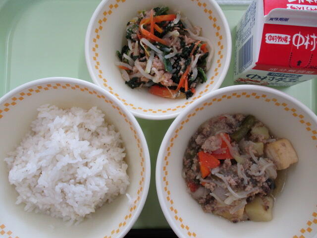 【麦ご飯 里いものそぼろに ほうれん草のおひたし 牛乳】