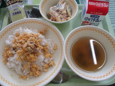 昔からお祝いの食事として、赤飯が食べられてきました。そのため、給食でも赤飯と、デザートをつけてお祝いです。