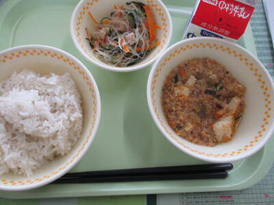 今日は、日之影町産のピーマン・きゅうりをたくさん使ったサラダです。また、今日は、特別に日之影町産の牛肉をいただけることになりましたので、献立の名前をひのかげ牛丼にしました。日之影町の生産者の方がたくさんの愛情をそそいで、大切に育てられたたべものです。