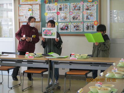 お誕生日の人が自己紹介をしたり、保健給食委員会の人が4月のお誕生花を紹介したり、牛乳乾杯をしたりして、いつもと違う雰囲気で給食を楽しみました。