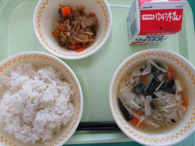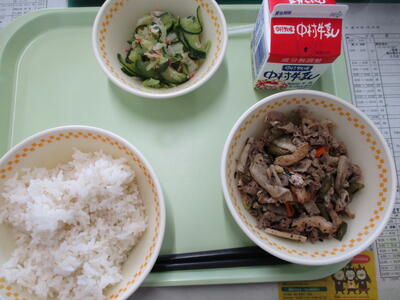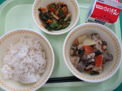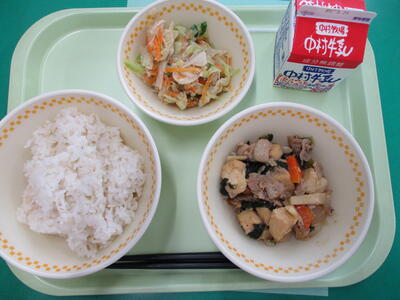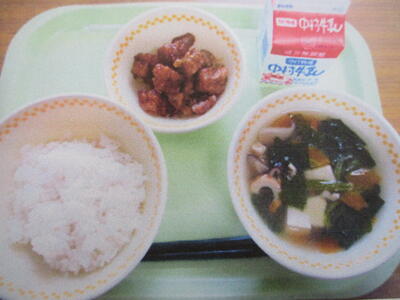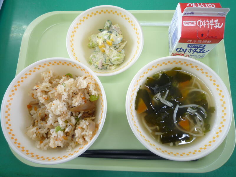 かしわめしは、福岡県の郷土料理の一つです。福岡県では、鶏肉のことを「かしわ」と呼ぶのだそうです。今日の給食は、鶏肉の他にも、ごぼうやにんじん、青豆を入れ栄養満点にしました。鶏肉のだしや野菜の甘みがよく出ていておいしいです。