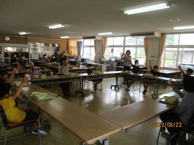 保健給食委員会の人から、6月生まれの誕生花の紹介やクイズがあり、とても楽しいお誕生給食会になりました。