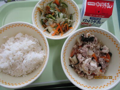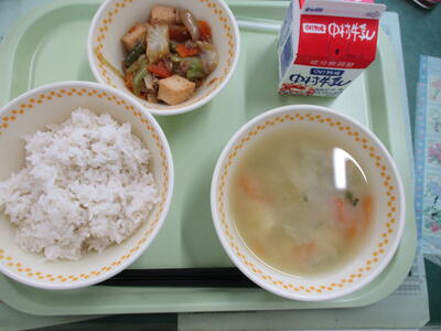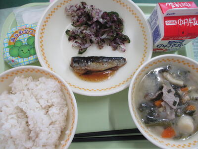 豚肉は、体を構成する成分であるたんぱく質を多く含んでいますが、他の肉に比べて、ビタミンB1が多いのが特徴です。ビタミンB1は、疲れをとったり、いらいらを防いだりする働きがあります。豚肉は、くせがなく食べやすい肉です。どんな料理にも合うので、給食でもよく使っています。今日は、キャベツやたまねぎ、にんじん、干ししいたけ、油揚げと一緒に炒めてみそで味をつけました。