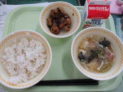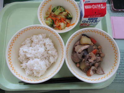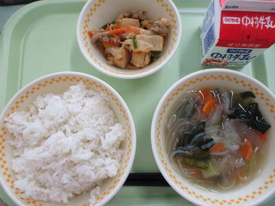 豆腐は、消化がよく、栄養価も高い食べものです。2000年以上も前に、中国で作られました。奈良時代に、日本に伝わり、主に、お寺などで食べられ、江戸時代になって日本中の人が食べられるようになったそうです。今日の給食では、とうふを干ししいたけやにんじん、たけのこ、にら、たまねぎと一緒に五目煮にしました。
