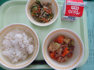 今日は、給食の中でも人気メニューのひとつのカレーです。今日のカレーは、豚肉を使ったポークカレーです。さらさらと食べやすいですが、しっかりかんで食べてほしいです。