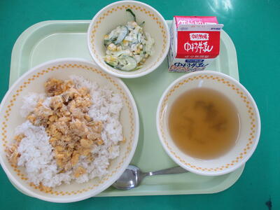 鶏飯は鹿児島県の奄美大島の郷土料理です。江戸時代から伝わる伝統的な料理として奄美大島では親しまれています。鶏飯は薩摩藩のお役人の視察の時のおもてなし料理として振るまわれていたそうです。奄美大島ではごはんの上に鶏ガラスープで煮た鶏肉やしいたけ、錦糸卵やパパイヤの漬物をのせて、スープをかけて食べるのだそうです。給食ではパパイヤの漬物代わりに山川漬けと福神漬けを使って作りました。サラサラと食べることができますが、しっかりとよくかんで食べましょう。