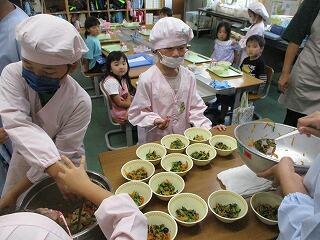 今日は、地産地消給食の日です。日之影町産の食材であるゆず酢は、深角にあるゆずの華さんが作られているもので、そのゆず酢を使って、ゆずの香りあえを作りました。日之影町の方言で、果汁のことを「酢」というのだそうです。今日のゆずの香りあえは、ゆずのさわやかな風味がきいて、とてもおいしくできあがりました。
